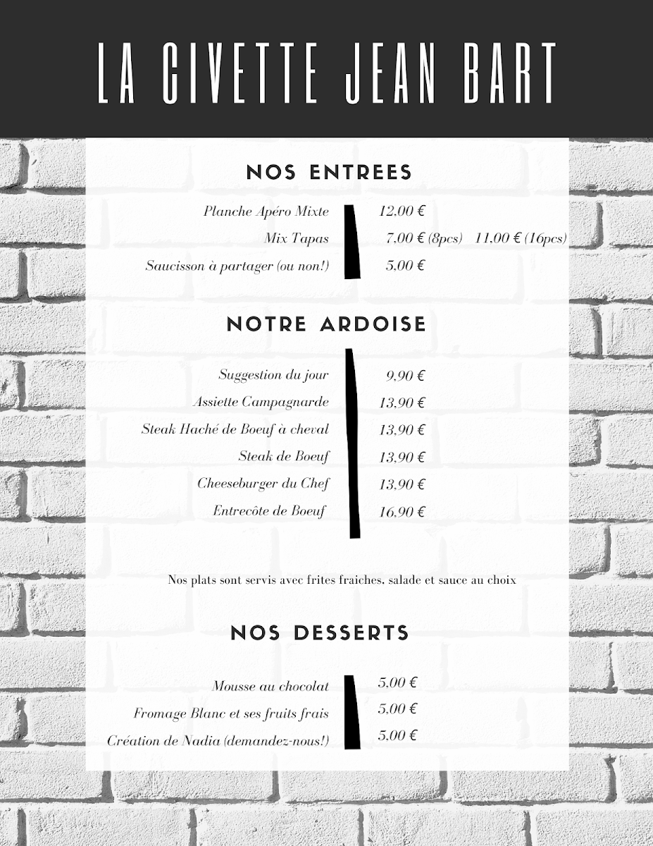 Welcome to La Civette Jean Bart, a charming brasserie nestled in the heart of Dunkerque. This inviting eatery, located at 11 Pl. Jean Bart, offers a menu that captures the essence of French cuisine with heartwarming hospitality. The talented Nadia curates a delightful selection of dishes, starting with tempting entrées like the rustic Terrine de campagne and a variety of fresh salads, all priced affordably at €4.00.